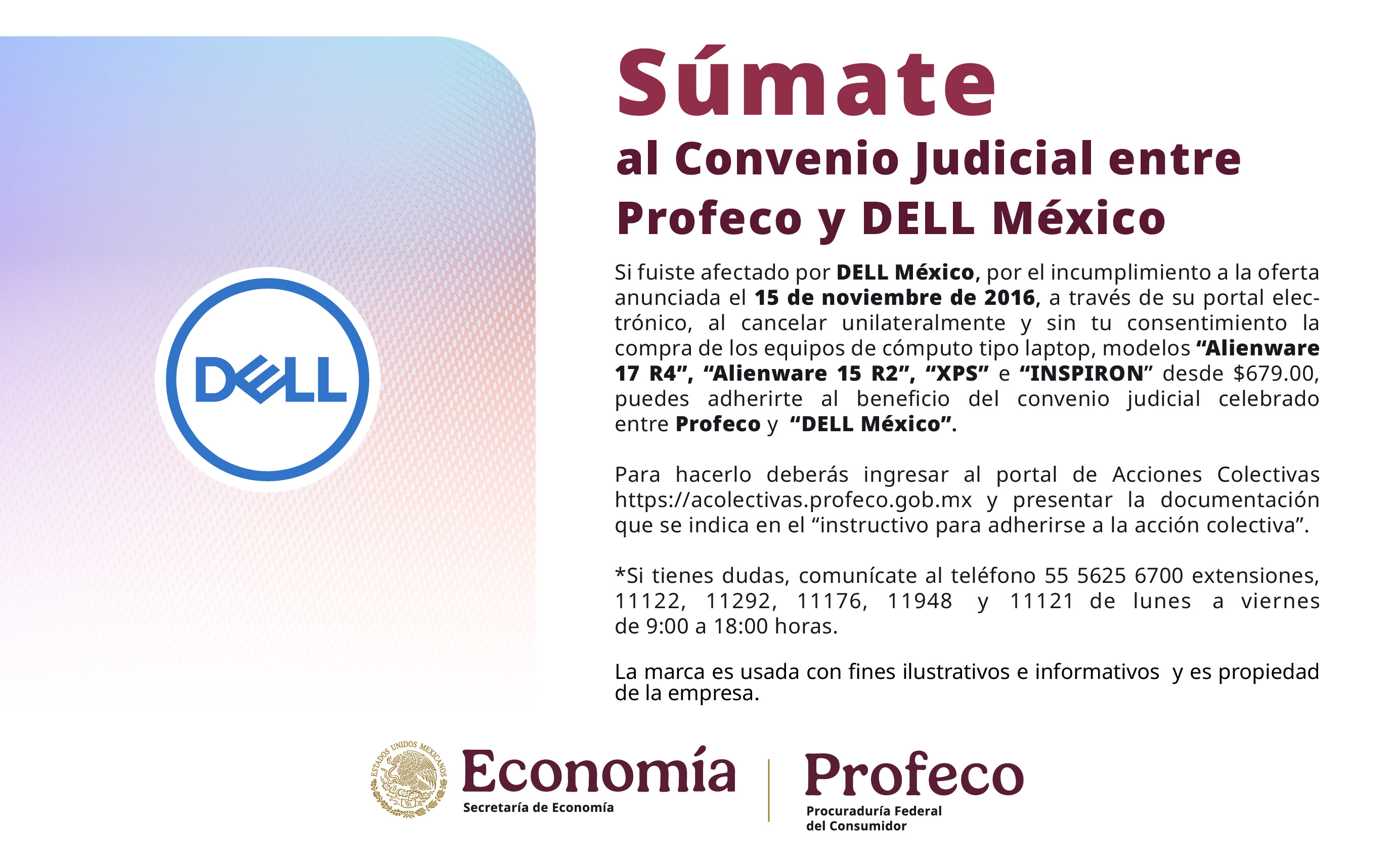 Tel. 555 625 6700 Ext. 11773, 11263, 11180 o 11123 colectivas.ejecucion @profeco.gob.mx |